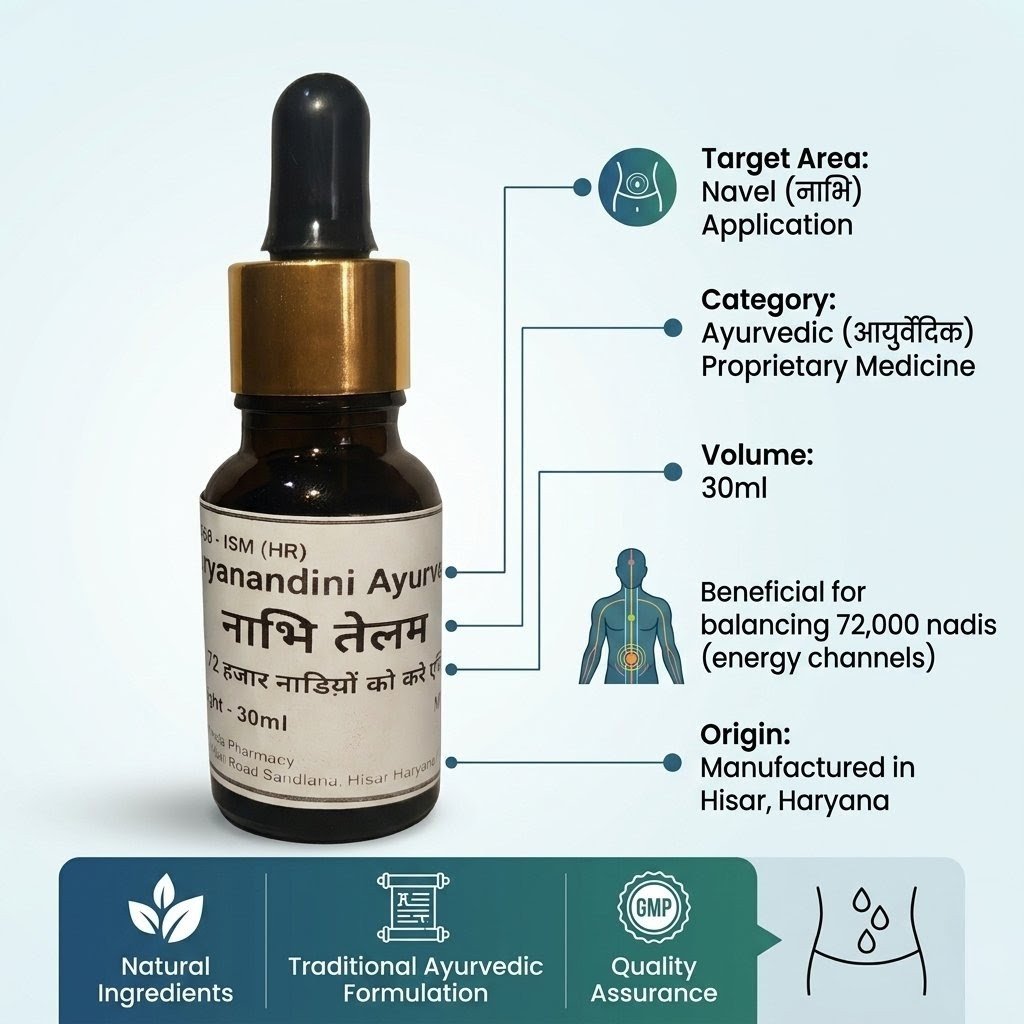 Discover the ancient Ayurvedic secret to vitality with our Nabhi Tailam. In Ayurveda, the navel (Nabhi) is considered the center of the body’s energy. This proprietary medicine is specifically formulated for application on the navel to help balance the 72,000 nadis (energy channels) that flow throughout the human body.